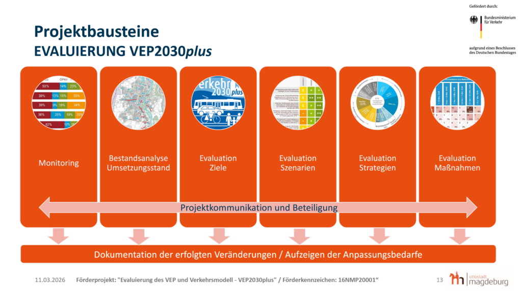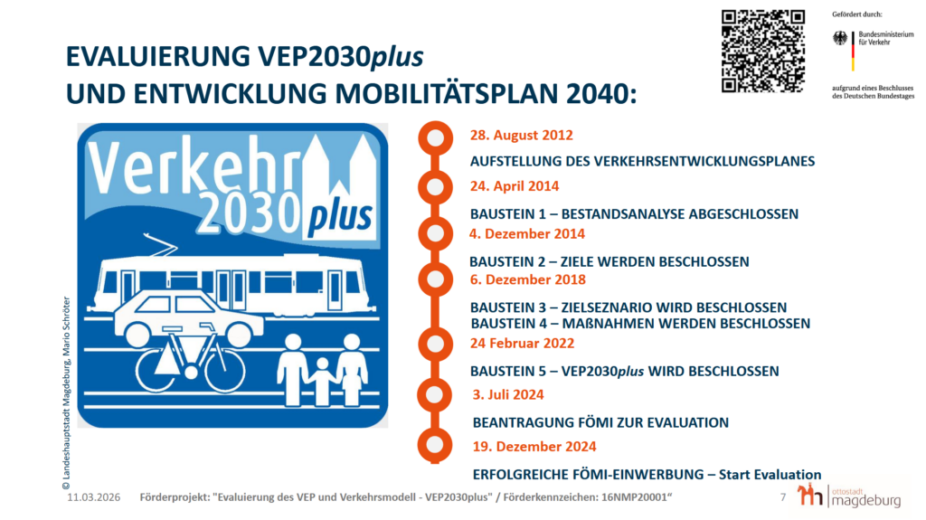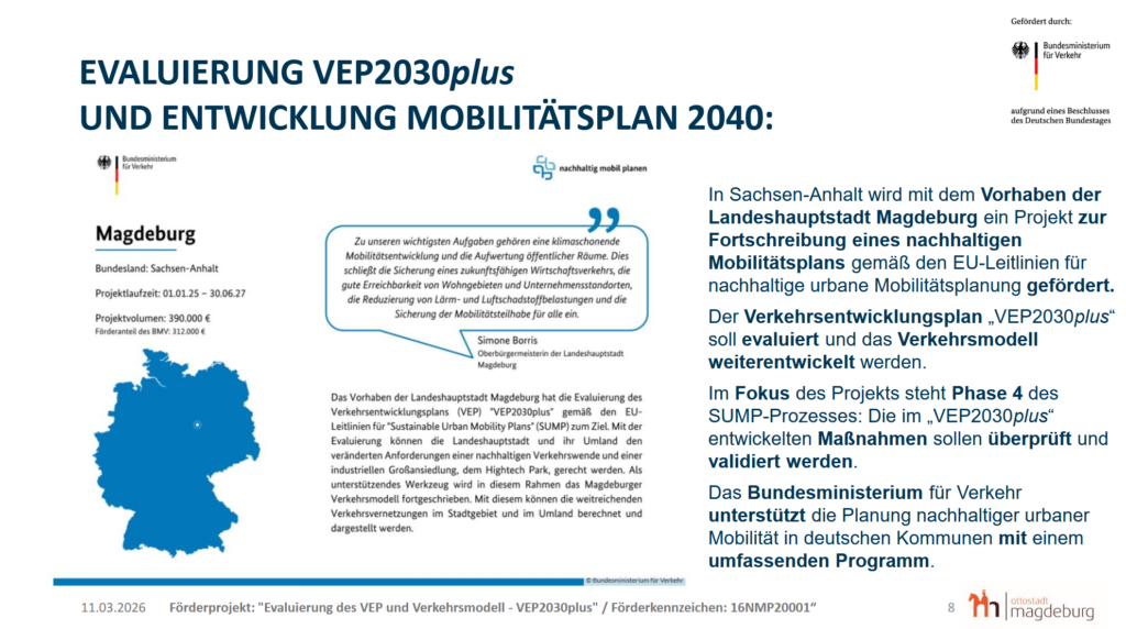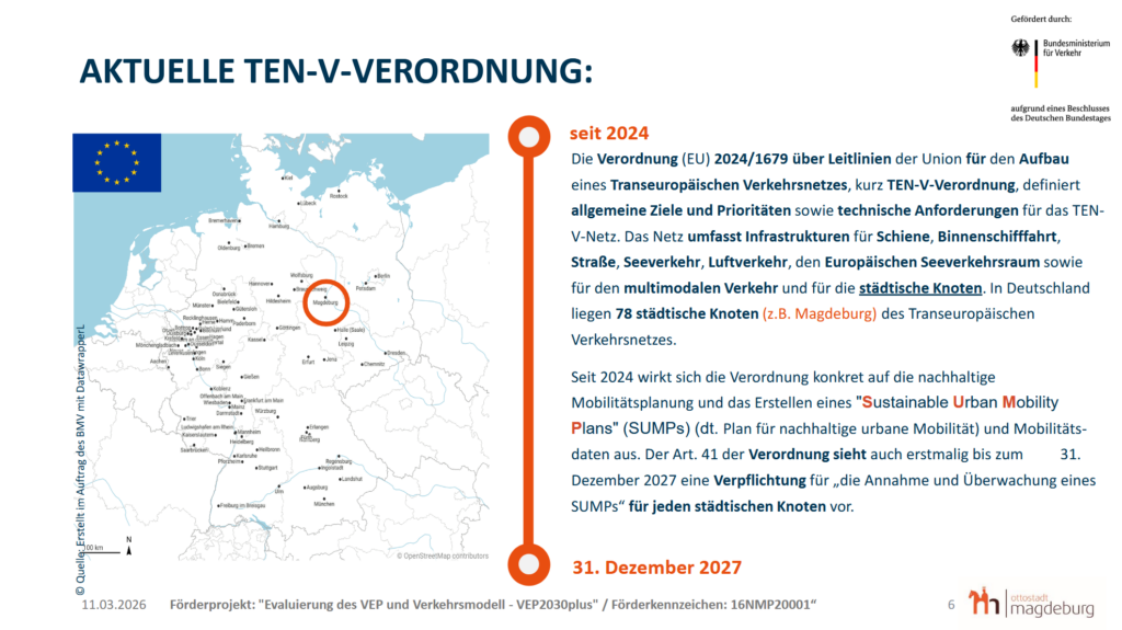 Im nächsten Teil der Veranstaltung folgte ein kurzer Input-Vortrag von Herrn Schröter zu den Hintergründen des Projektes (siehe Grafiken der Präsentationsfolien). Er erläuterte, dass beim Aufbau des Transeuropäischen Verkehrsnetzes 78 städtische Knoten für Deutschland definiert wurden. Dazu zählt auch die Landeshauptstadt Magdeburg. Seit 2024 sieht eine Verordnung der europäischen Union das Aufstellen eines „Sustainabel Urban Mobility Plan“ (SUMP) (dt. Plan für nachhaltige urbane Mobilität) verpflichtend bis zum 31.12.2027 vor. Er erklärte, dass es in Zukunft auch zum Beantragen von Fördermittel der europäischen Union wichtig ist, einen solchen Plan vorweisen zu können. Anschließend stellte den Zeitablauf für die Erarbeitung des Verkehrsentwicklungsplanes (VEP) 2030plus von 2012 bis zu seinem Beschluss 2022 und die geplante Prozessabfolge der Evaluationsphase vor.